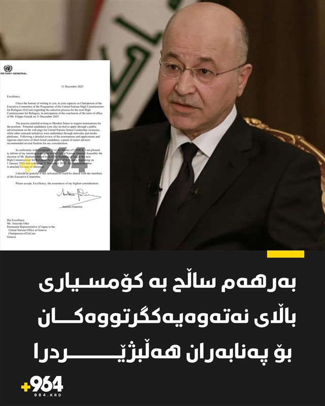 - #بەرهەم ساڵح# پۆستی کۆمسیاری باڵای #نەتەوە یەکگرتووەکان#ی بۆ کاروباری پەنابەران وەرگرت. ئەم پۆستە باڵاترین پۆستی ڕێکخراوی نەتەوە یەکگرتووەکانە کە تا ئەمڕۆ کوردێک وەری گرتبێت.[1]