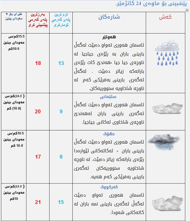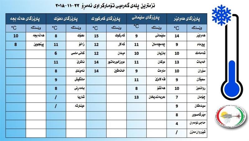 - لە دەڤەری بەرواری سەر بە شارۆچکەی #ئامێدی#، بەفربارین دەستیپێکرد. بەڕێوەبەری کەشناسی و بومەلەرزەزانی ئامێدیش دەڵێت: شەپۆلی بەفروباران تا شەممەی داهاتوو بەردەوام دەبێت.[4]