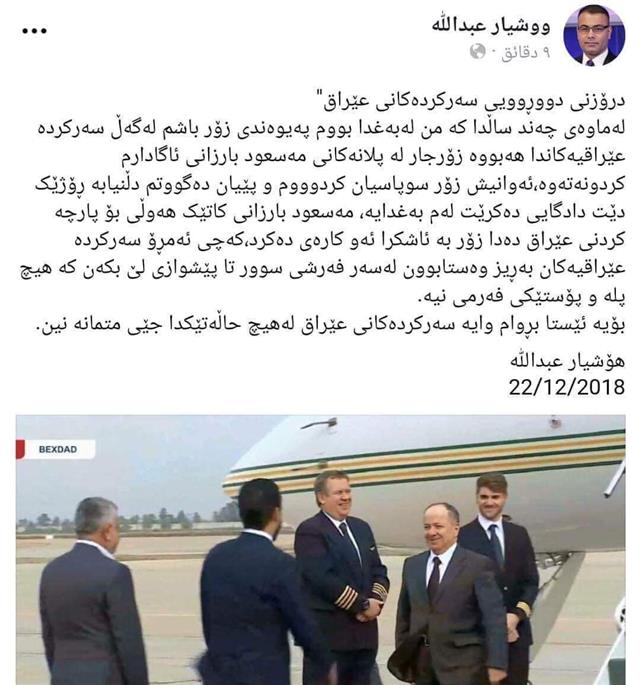- #مەسعود بارزانی# لە کۆنگرەیەکی ڕۆژنامەڤانیی هاوبەشدا لەگەڵ ڕێبەری هاوپەیمانیی فەتح ڕایگەیاند: بۆ پشتگیریکردنی ئەو هەلە نوێیەی لە عێراق هاتووەتە پێشەوە، سەردانی بەغدام کردووە.[1]