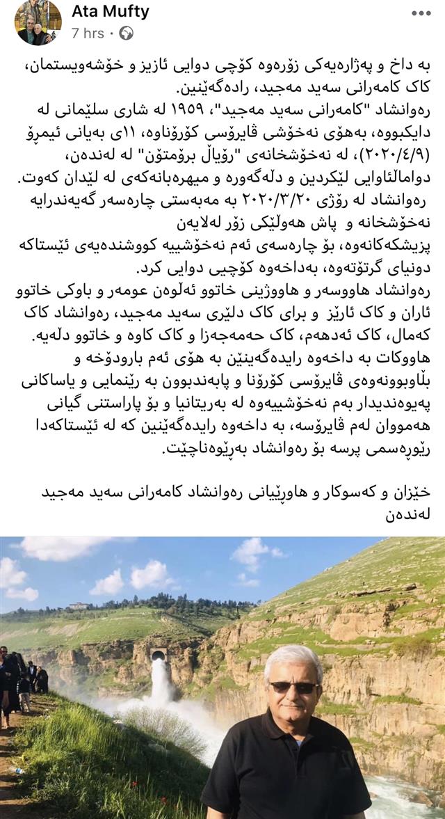- کامەرانی سەید مەجید برای دلێری سەید مەجید لە تەمەنی 61 ساڵیدا بەهۆی کۆرۆناوە لە نەخۆشخانەیەکی لەندەن کۆچی دوایی کرد.[3]
