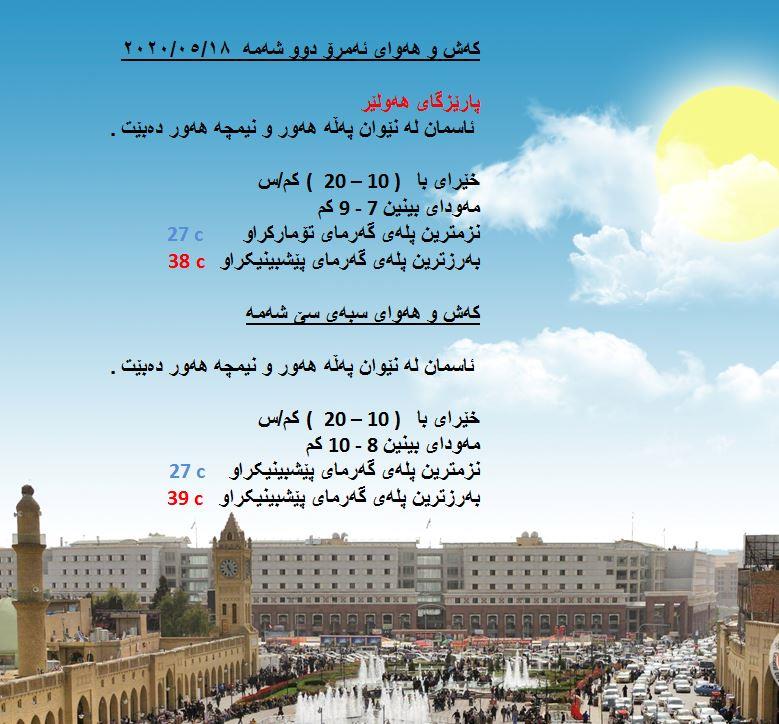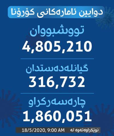 - جهانپور ڕایگەیاند: بەپێی ئەنجامی پشکنینەکان لە 24 کاتژمێری ڕابردوو هەزار و 294 حاڵەتی تووشبوون بە ڤایرۆسی کۆرۆنا لە سەرتاسەری ئێران تۆمارکراوە و بەوپێیەش ژمارەی گشتی تووشبووان گەیشتووەتە 122 هەزار و 492 کەس، هەر لەو ماوەیەدا، 69 تووشبووی کۆرۆنا گیانیان لەدەستداوە و ژمارەی گشتی گیانلەدەستدان بە کۆرۆنا لە ئێران گەیشتووەتە حەوت هەزار و 57 کەس، تا ئیستاش 95 هەزار و 661 تووشبووی کۆرۆنا چاکبوونەتەوە و دوو هەزار و 712 تووشبووش لەژێر چاودێڕی چڕدان.[3]
