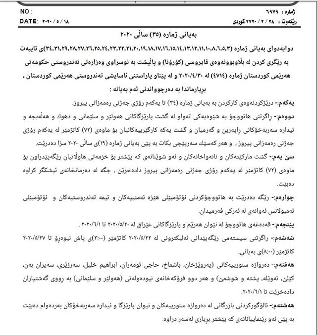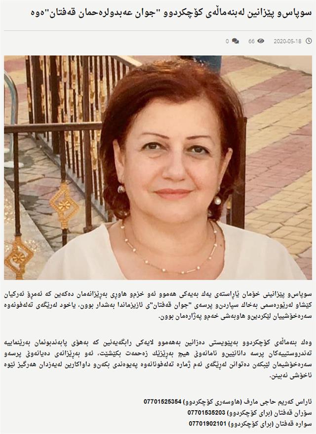 - پارێزگای #وان# لە ڕاگەیێنراوێکدا ئاماژەی بەوەدا، لە گەڕەکی ئەمین پاشا سەر بە شارۆچکەی ئارتەمێتان، بەهۆی دانانی پرسەیەک ڤایرۆسی #کۆرۆنا# بڵاوبووەتەوە و لەنێو ئەو کەسانەی بەشداری پرسەکەیان کردووە ئەنجامی پشکنینی 12 کەس پۆزەتیڤ بووە.[1]