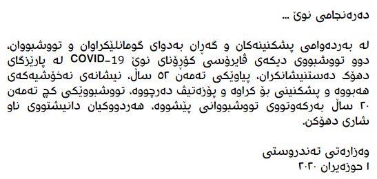 - وەزیری ناوخۆی هەرێمی کوردستان داوا لە هاووڵاتیانی سڤیل و فەرمانبەران و کارمەندانی هێزە ئەمنییەکان دەکات کە لە پارێزگاکانی عێراق دەوام دەکەن، تاوەکو ڕۆژی #06-06-2020# لە شوێنەکانی خۆیان بمێننەوە و پابەندی ڕێنماییە تەندروستییەکان بن.[1](بڕوانە فایلی پەیوەندیدار)