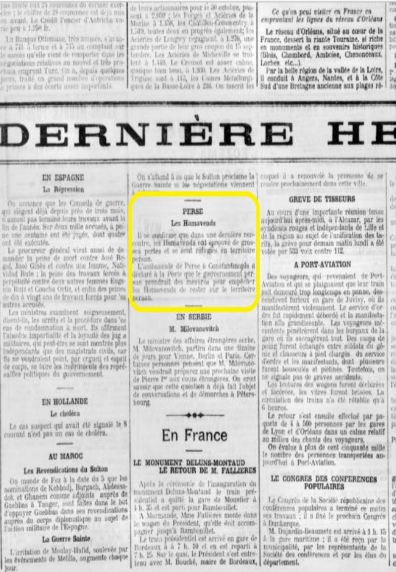 ڕۆژنامەی فەرەنسی NATIONAL LE کە لە رۆژی دووشەممەی رێکەوتی #11-10-1909# دا، چاپ و بڵاوکراوەتەوە، هەواڵێکی لەژێر ناونیشانی فارس هەمەوەندەکان بڵاوکردۆتەوە و نووسیویەتی: