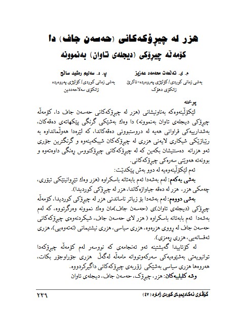 لێکۆڵینەوەکە بەناونیشانى (هزر لە چیڕۆکەکانى #حەسەن جاف# دا، کۆمەڵە چیڕۆکى دیجلەى تاوان بەنموونە) دا وەک بەشێکى گرنگى پێکهاتەى دەقەکان، بەشدارییەکى فراوانى هەیە لە دروستبوونى دەقەکاندا، کە لێرەدا هەوڵمانداوە بە رێبازێکى شیکارى لایەنى هزرى لە چیڕۆکەکان شیبکەینەوە و گرنگترین جۆرى ئه و هزرانە دەستنیشان بکەین کە لە چیڕۆکەکانى چیڕۆکنووس ڕەنگى داوەتەوە و بوونەتە هەوێنى سەرەکى چیڕۆکەکانى. ئەم لێکۆڵینەوەیە لە دوو بەش پێکدێت: بەشى یەکەم: لەم بەشەدا ئەم بابەتانە باسکراوە (هزر وەک تێڕوانینێکى تیۆرى، چەمکى هزر، هزر لە دەقە جیاوازەکاندا، هزر لە چیڕۆکى کوردیدا). بەشى دووەم: لەم بەشەدا بۆ زیاتر ناساندنى هزر لە چیڕۆکى کوردیدا، کۆمەڵە چیڕۆکى (دیجلەى تاوان)ى (حەسەن جاف)مان وەک نموونە وەرگرتووە، کە لەم بەشەدا ئەم بابەتانە باسکراوە ( هزر لاى حەسەن جاف، شیکردنەوەى چیڕۆکەکانى حەسەن جاف لە ڕووى هزرەوە، هزرى سیاسى، هزرى نیشتیمانى (نەتەوەیی)، هزرى ئەفسانەیى، هزرى ڕەمزى). لە کۆتاییدا گەیشتینە ئه و ئەنجامەى کە نووسەر لەم کۆمەڵە چیڕۆکەدا توانیویەتى بەشێوەیەکى سەرکەوتووانە مامەڵە لەگەڵ هزرى جۆراوجۆر بکات، هەروەها هزرى سیاسى بەشێکى زۆربەى چیڕۆکەکانى داگیرکردووە.[1]
