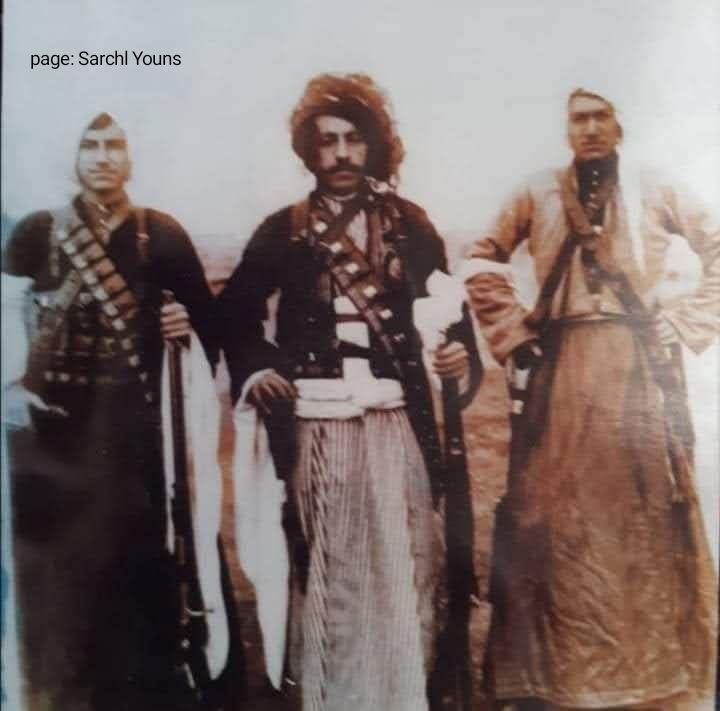 کەسایەتییەکانی ناو وێنەکە: شێخ عوسمانی نەقشبەندی و #سەنجەرخانی وەزیری# سەرکردەی قەڵای میاوەرانی سنە و شێخ مەولانای نەقشبەندی لە کاتی غەزای ڕووسدا گیراوە ساڵی 1915 دا، چاوگی وێنەکە: ئامانج شێخ ناجی نەقشبەندی.