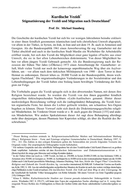 Die Geschichte der kurdischen #Yezidi# hat sich bis vor wenigen Jahrzehnten beinahe exklusiv in einer ihnen feindlich gesonnenen islamischen (und teils christlichen) Umwelt abgespielt,vor allem in der Türkei, in Syrien, im Irak, in Iran und seit dem 19. Jh. auch in Armenien und Georgien. Als die Bundesrepublik 1961 einen Anwerbevertrag für sog. Gastarbeiter mit der Türkei abschloß und auch in der kurdischen Stadt Mardin ein Werbebüro für Arbeitskräfte eröffnet wurde, bot sich den Yezidi die Möglichkeit einer ganz legalen »Flucht« aus einer Umwelt, die sie in fast allen Lebensbereichen diskriminierte. Von dieser Möglichkeit ha-ben vor allem jüngere Yezidi Gebrauch gemacht. Als die Bundesregierung nach der Re-zession der frühen 70er Jahre (»Ölkrise«) 1973 einen Anwerbestopp für Gastarbeiter er-ließ, blieb vielen Yezidi nur noch der keineswegs unproblematische Weg über ein Asylver-fahren, um – vor allem nach dem türkischen Militärputsch von 1980 – dem Terror in ihrer Heimat zu entkommen. Derzeit leben ca. 20.000 Yezidi in der Bundesrepublik, ihrem wich-tigsten Fluchtland.2 Die migrationsbedingten Veränderungen in der Sozialstruktur und den Lebensbedingungen der Yezidi haben eine bislang kaum bewältigte Veränderung der Reli-gion zur Folge.[1]