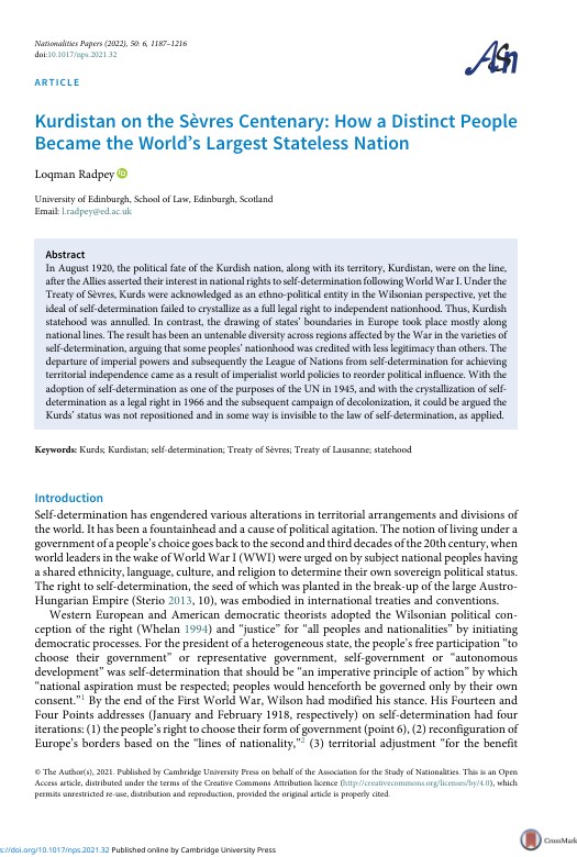 Kurdistan on the Sèvres Centenary: How a Distinct People Became the World’s Largest Stateless Nation