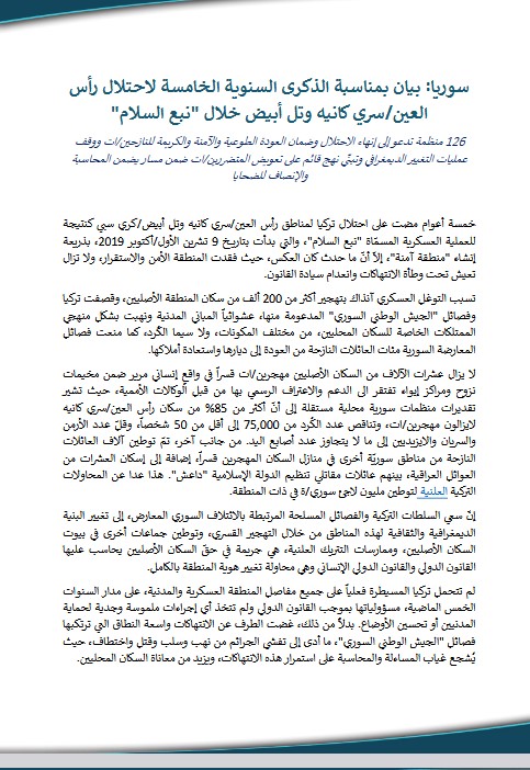 سوريا: بيان بمناسبة الذكرى السنوية الخامسة لاحتلال رأس العين/سري كانيه وتل أبيض خلال نبع السلام
