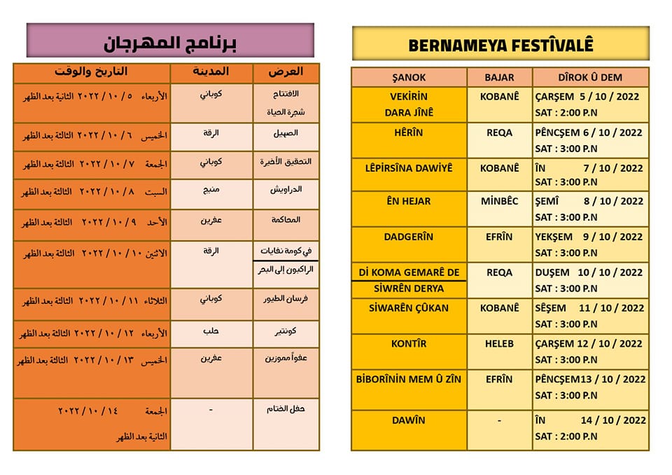 Li gorî bernameya komîteya Amadekar festîvan dê di 5'ê meha 10'an de û di saet 2'an de li navenda çand û hunera Baqî Xido dest pê bike û heta dîroka 14'ê meha 10'an dirêj bike û her wiha dê derdora 10 şanoyên cuda cuda ji bajarên cuda yên mîna Reqa, Minbic, Efrîn û Helebê werin pêşkêş kirin.