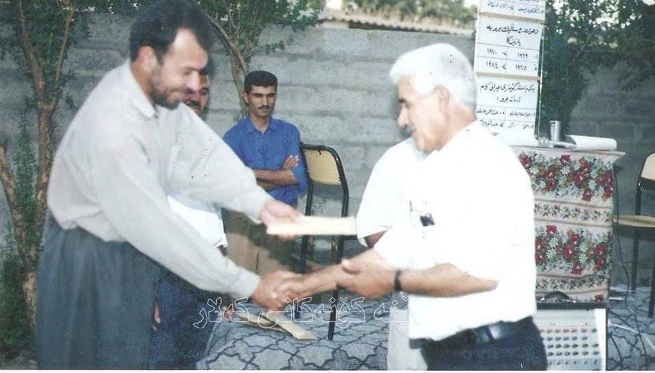 پێناسی وێنەکە: بەخشینی خەڵات بە مامۆستای کۆچکردوو کەریم ئەحمەد ناسراو بە (#کەریم سەرسپی#) لەلایەن نووسەر و وەرگێڕ مامۆستا مستەفا سەعید.[1]