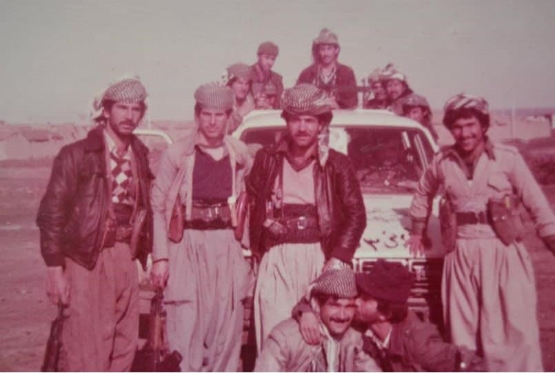 کەسایەتییەکانی ناو وێنەکە: پێشمەرگەکانی تیپی 86ی دەشتی هەولێری #یەکێتی نیشتمانی کوردستان# لەچەپەوە ڕاوەستاوەکان: خالید حاجی، نەناسراو، فەرهاد کادیر، نەناسراو.