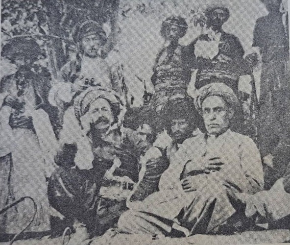 کەسایەتییەکانی ناو وێنەکە: لە ڕاستەوە: شێخ نووری نەقیب و #شێخ مەحمودی حەفید# (مەلیکی کوردستان، دامەزرێنەری یەکەمین حکومەتی کوردستان و قارەمانی شەڕی #دەربەندی بازیان#))، لەگەڵ کۆمەڵێک لە چەکدار و پاسەوانەکانی.