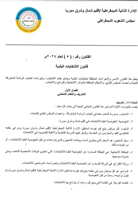 تحسبًا للانتخابات البلدية المقبلة في شمال شرق سوريا، المقرر إجراؤها في 11 ي-06- 2024، أصدرت #الإدارة الذاتية# في إقليم شمال وشرق سوريا قانونًا جديدًا يشرح العملية الانتخابية. تمت الدعوة لإجراء الانتخابات وفقًا لعقد الاجتماعي الجديد الذي تم نشره في ديسمبر 2023.[1]