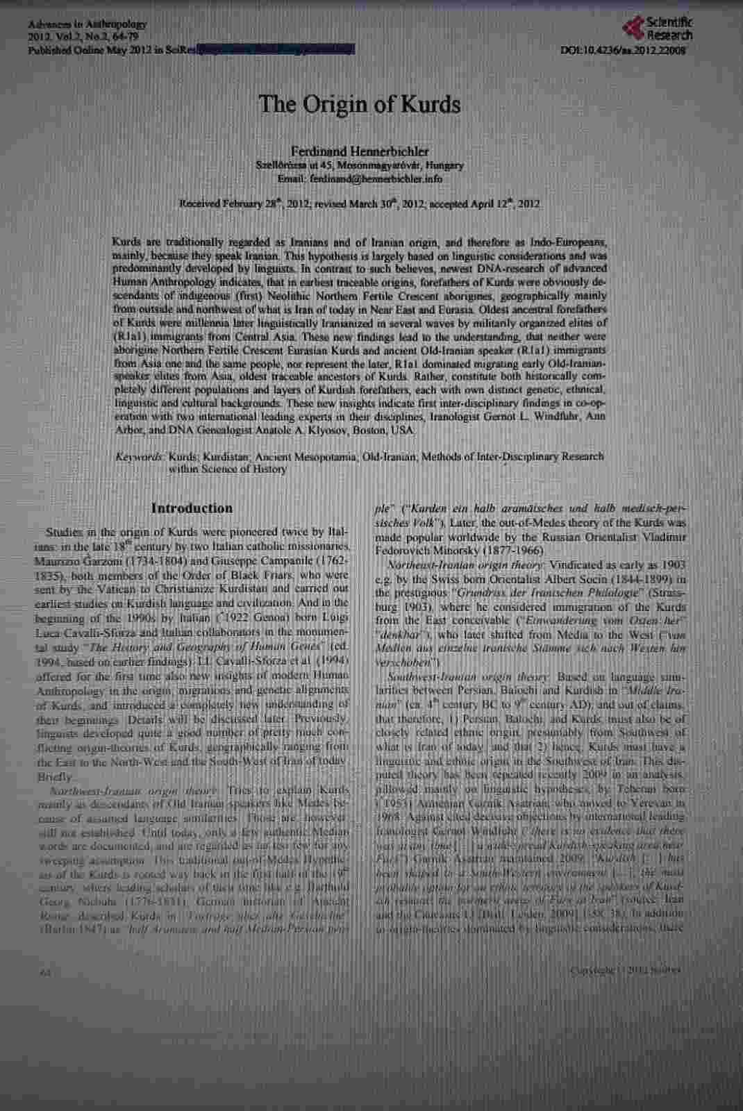 Kurds are traditionally regarded as Iranians and of Iranian origin, and therefore as Indo-Europeans, mainly, because they speak Iranian. This hypothesis is largely based on linguistic considerations and was predominantly developed by linguists. In contrast to such believes, newest DNA-research of advanced Human Anthropology indicates, that in earliest traceable origins, forefathers of Kurds were obviously descendants of indigenous (first) Neolithic Northern Fertile Crescent aborigines, geographically mainly from outside and northwest of what is Iran of today in Near East and Eurasia. Oldest ancestral forefathers of Kurds were millennia later linguistically Iranianized in several waves by militarily organized elites of (R1a1) immigrants from Central Asia. These new findings lead to the understanding, that neither were aborigine Northern Fertile Crescent Eurasian Kurds and ancient Old-Iranian speaker (R1a1) immigrants from Asia one and the same people, nor represent the later, R1a1 dominated migrating early Old-Iranianspeaker elites from Asia, oldest traceable ancestors of Kurds. Rather, constitute both historically completely different populations and layers of Kurdish forefathers, each with own distinct genetic, ethnical, linguistic and cultural backgrounds. These new insights indicate first inter-disciplinary findings in co-operation with two international leading experts in their disciplines, Iranologist Gernot L. Windfuhr, Ann Arbor, and DNA Genealogist Anatole A. Klyosov, Boston, USA. [1]