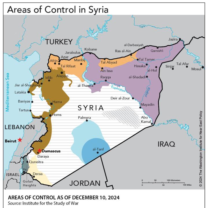 Bashar al-Assad’s fall has quickly changed the map of Syria. While the jihadist group Hayat Tahrir al-Sham (HTS) and its allies swept out of their base in Idlib to seize major regime strongholds en route to the capital, other opposition groups moved to take territory in the southeastern provinces of Deraa and Quneitra. In the central and southern Badia desert region, the U.S.-backed opposition faction Maghawir al-Thawra has expanded its control around the American garrison at al-Tanf. Remnants of the #Islamic State# (IS) prowl the desert too, liable to strike at any moment. And in the northeast, the U.S.-backed, Kurdish-led Syrian Democratic Forces (SDF) moved deeper into Raqqa but lost ground in Tal Rifaat and Manbij due to advances by the Syrian National Army (SNA), the local coalition of Turkey-backed militias.