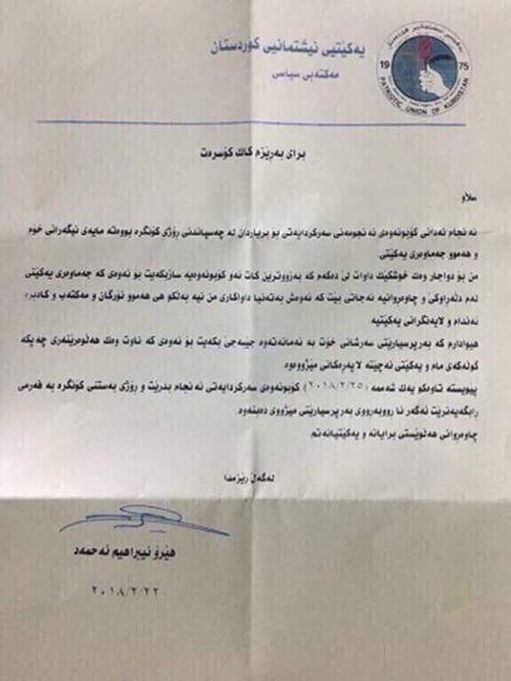 هێرۆ ئیبراهیم ئەحمەد نامەیەکی تووند بۆ کۆسرەت ڕەسوڵ دەنێرێت بۆ سازدانی کۆبوونەوەی سەرکردایەتی و دانانی ڕۆژی کۆنگرە