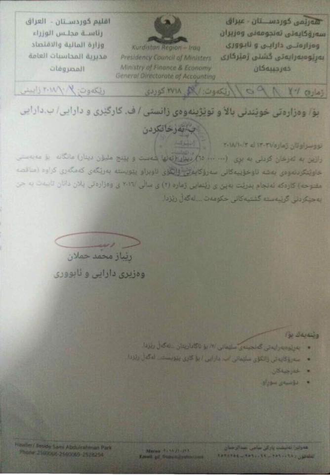 وەزیری دارایی و ئابوری فەرمانی بە خەرجکردنی بڕە پارەیەک دەکات بۆ زانکۆی سلێمانی