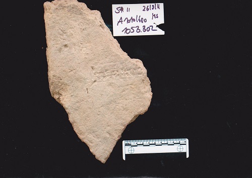 پارچە خشتێکی دۆزراوە، لە گردی ساتوقەڵای شارەدێی تەقتەق، کەنوسینی مێخی لەسەرە، لەساڵی 2011دا.