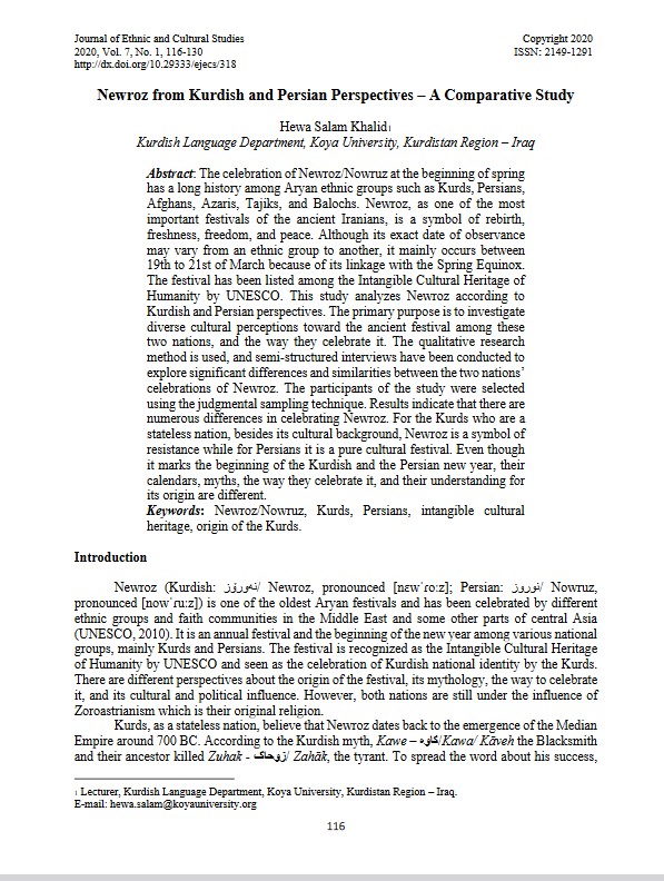 beginning of spring has a long history amongAryanethnic groups such asKurds, Persians, Afghans, Azaris, Tajiks, and Balochs. Newroz,as one of the most important festivalsof the ancient Iranians,is a symbol of rebirth, freshness, freedom,and peace. Although its exact date of observance may vary from an ethnicgroupto another, it mainly occurs between 19thto 21st of Marchbecause of its linkage with the Spring Equinox. The festivalhas been listed among the Intangible Cultural Heritage of Humanity by UNESCO. This study analyzes Newroz according to Kurdish and Persian perspectives. Theprimarypurpose is to investigate diverse cultural perceptionstoward the ancient festivalamong these two nations, and the waythey celebrateit. The qualitativeresearch method is used, and semi-structured interviews have been conducted to explore significantdifferencesand similarities between the two nations’ celebrations of Newroz. The participants of the study were selected using the judgmental sampling technique. Results indicate that there are numerousdifferences in celebrating Newroz. For the Kurds who are a stateless nation, besides its cultural background, Newroz is a symbol of resistancewhilefor Persians it is a pure cultural festival. Even though it marks the beginning of the Kurdish and the Persian new year, theircalendars, myths, the way they celebrateit,and their understanding for itsorigin are different.[1]