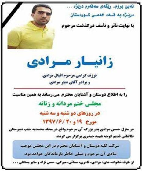 - بە بڵاوکردنەوەی ئاگادارینامە، هەوڵدرا لەلایەن کەسوکاریی #زانیار مورادی#یەوە لە شاری #مەریوان#-ی سەربە پارێزگای #سنە#، ئەمڕۆ پرسە بۆ شەهید زانیار دابنرێت، بەڵام ئیدارەی ئیتلاعاتی شاری مەریوان بە دەستگیرکردنی ڕێبوار مورادی مامی زانیار مورادی، ئاستەنگی دروستکرد و ناچاری کردن کە بڵاوکراوەکان کۆبکەنەوە و پرسەکە هەڵبوەشێنرێتەوە.[4]