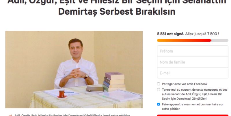 - لە سەر وێبسایتی چەینچ دۆت ئۆرگ کەمپەینیک بە ناوی بۆ هەڵژاردنێکی یەکسان و بی خەوش و ئازاد، با #سەلاحەدین دەمیرتاش# ئازاد بکرێت دەستیپێکرد و دەیانویست 5 هەزار ئیمزا کۆبکەنەوە، بەڵام لە ماوەیەکی زۆر کەمدا زیاتر لە 5 هەزار ئیمزایان کۆکردەوە.[2]