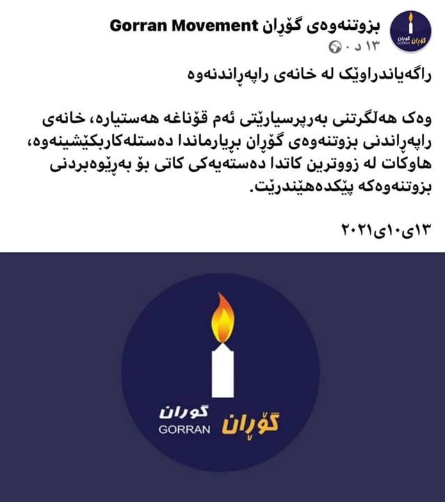 - ڕێکخەری گشتی و خانەی ڕاپەڕاندنی #بزووتنەوەی گۆڕان# دەستیان لەکارکێشایەوە.[1]