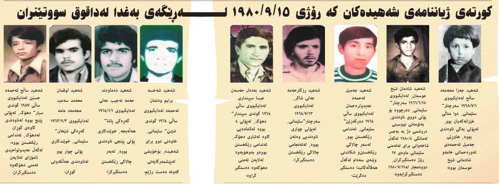 - داگیرکەری بەعس نۆ مێردمنداڵی کوردی لە ڕێی #داقوق# - #بەغدا# لە ئوتۆمبیلێکدا سووتاند. (#بەدەل حەسەن عیسا سپینداری#، #جەزا محەمەد ساڵح#، #جەمیل ئەحمەد عەبدولرەحمان#، #دەماوەند حەمە نەجیب عەلی#، #ڕزگار حەمەعەلی شاکر#، #ساڵح ئەحمەد حسێن#، #شادمان شێخ عوسمان#، #شەخسە برایم وەتمان ئەحمەد# و #لوقمان محەمەد سەعید محەمەد مامە#).