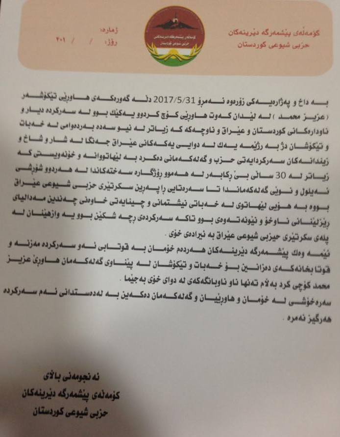 بەیاننامەی کۆمەڵەی پێشمەرگە دێرینەکانی حیزبی شیوعی بە بۆنەی کۆچی دوای عەزیز محەمەدەوە