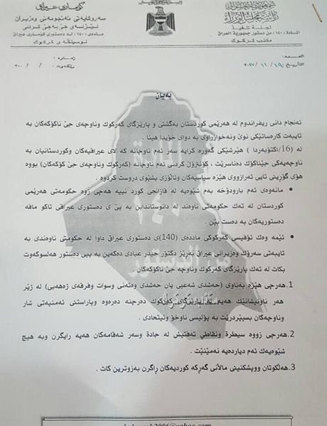 نووسینگەی کەرکووکی ماددەی 140 حەوت داواکاری ئاراستەی عەبادی دەکات