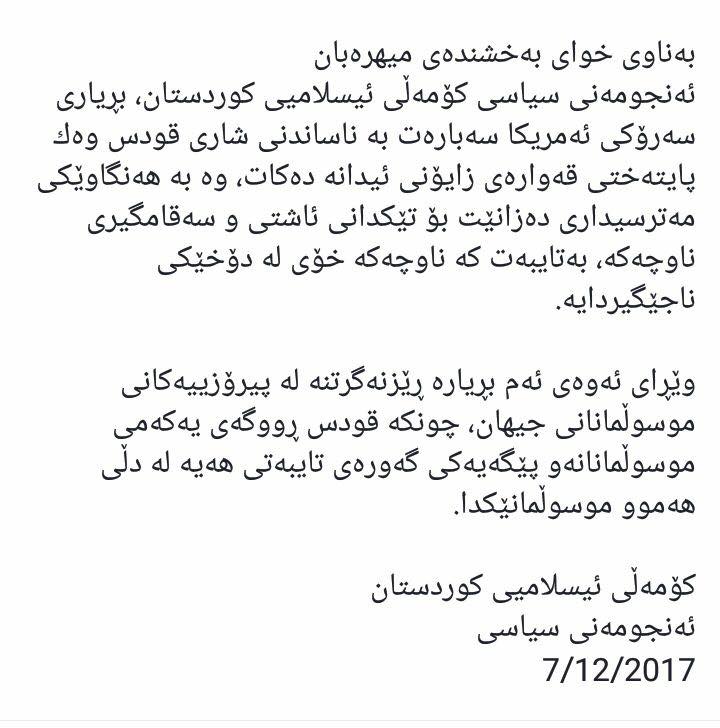 ناڕەزاییی کۆمەڵی ئیسلامیی کوردستان بەبۆنەی بوونی قودس بە پایتەختی ئیسرائیل