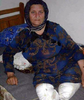 خانمێکی تەمەن 55 ساڵی دانیشتووی گوندی حەسەنی شارەدێی #ڕاجۆ#ی #ئەفرین#ە، ڕۆژی #25-02-2017# لەکاتی چوونی خێزانەکەیان بۆ ئەفرین، دەکەوێتە بەر شاڵای بۆردومانی فڕۆکەکانی تورکیا و هەردوو قاچی لەدەست دەدات. [1]