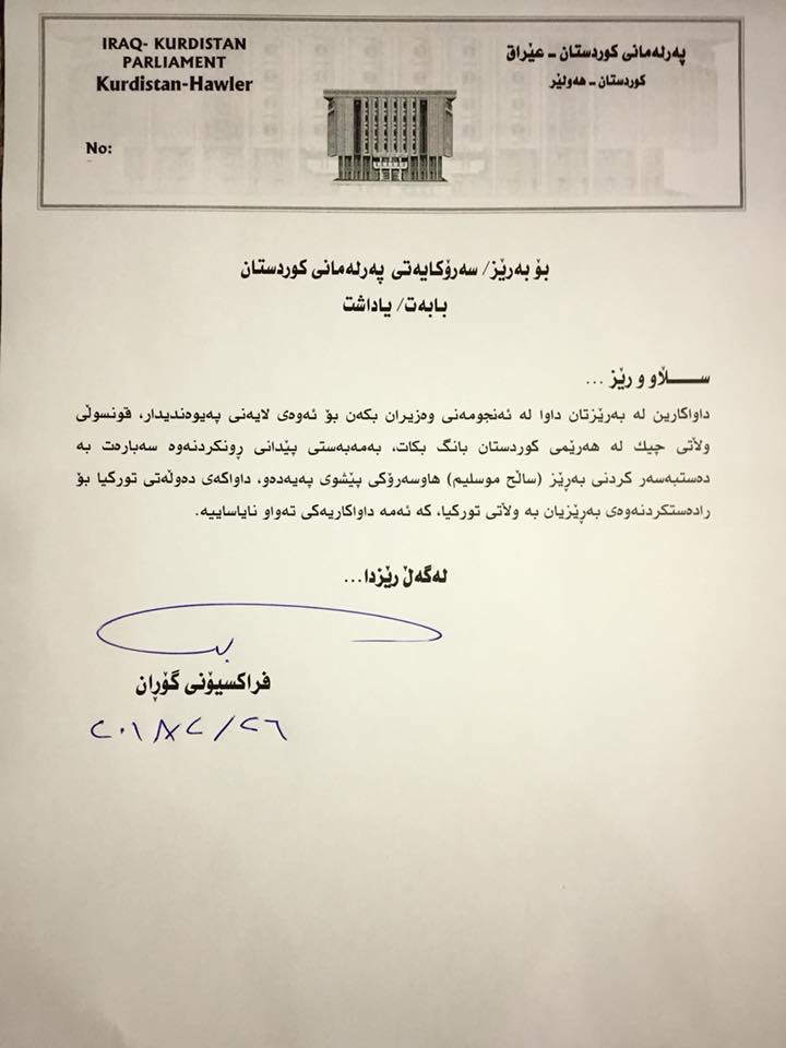 بۆ بەڕێز سەرۆکایەتی پەرلەمان