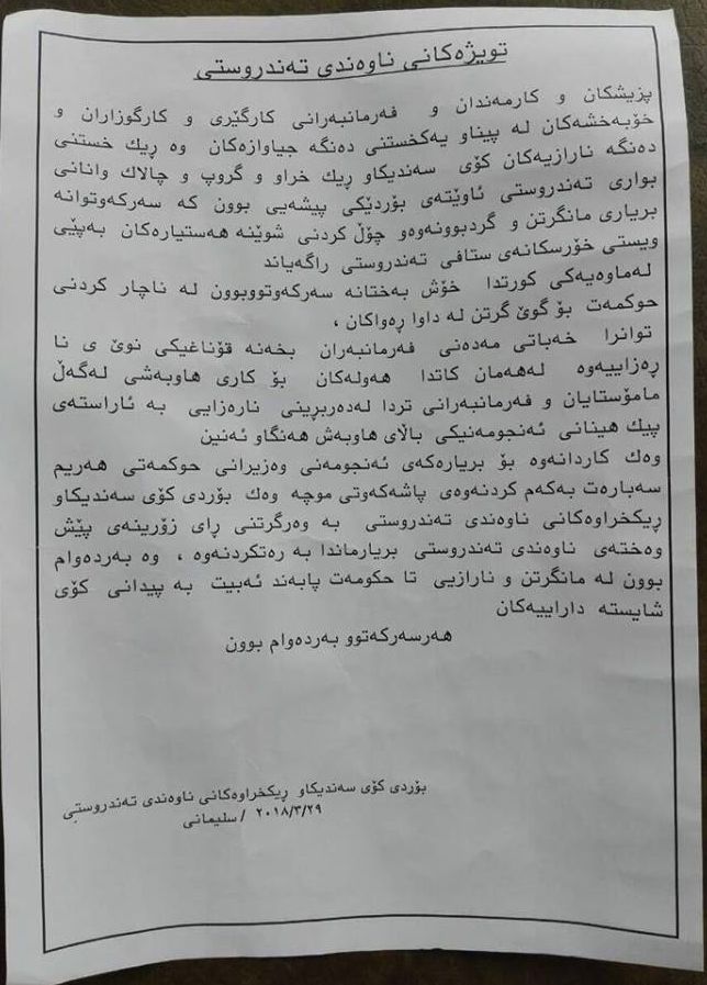ڕاگەیاندنی بۆردی کۆی سەندیکا و ڕێکخراوەکانی ناوەندی تەندروستیی سلێمانی لەسەر ناڕەزاییەکان