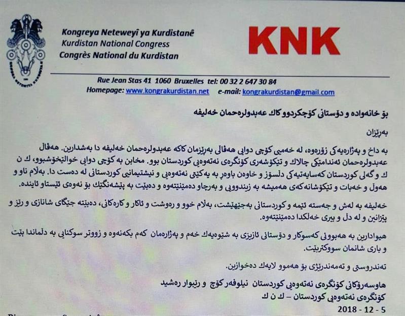 بە داخ و پەژارەیەکی زۆرەوە، لە خەمیی کۆچی دوایی هەڤاڵی بەڕێزمان کاکە عەبدولرەحمان خەلیفە دا بەشدارین. هەڤاڵ عەبدولرەحمان ئەندامێکی چالاک و تێکۆشەری کۆنگرەی نەتەوەیی کوردستان بوو. مخابن بە کۆچی دوایی خوالێخۆشبوو، ک ن ک و گەلی کوردستان کەسایەتیەکی دڵسۆز و خاوەن باوەڕ بە یەکێتی نەتەوەیی و نیشتیمانی کوردستانی لەدەست دا. بەڵام ناو و هەوڵ و خەبات و تێکۆشانەکەی هەمیشە بە زیندوویی و بەرچاو دەمێنێتەوە و دەبێتە پێشەنگێک بۆ نەوەی ئێستاو ئایندە.