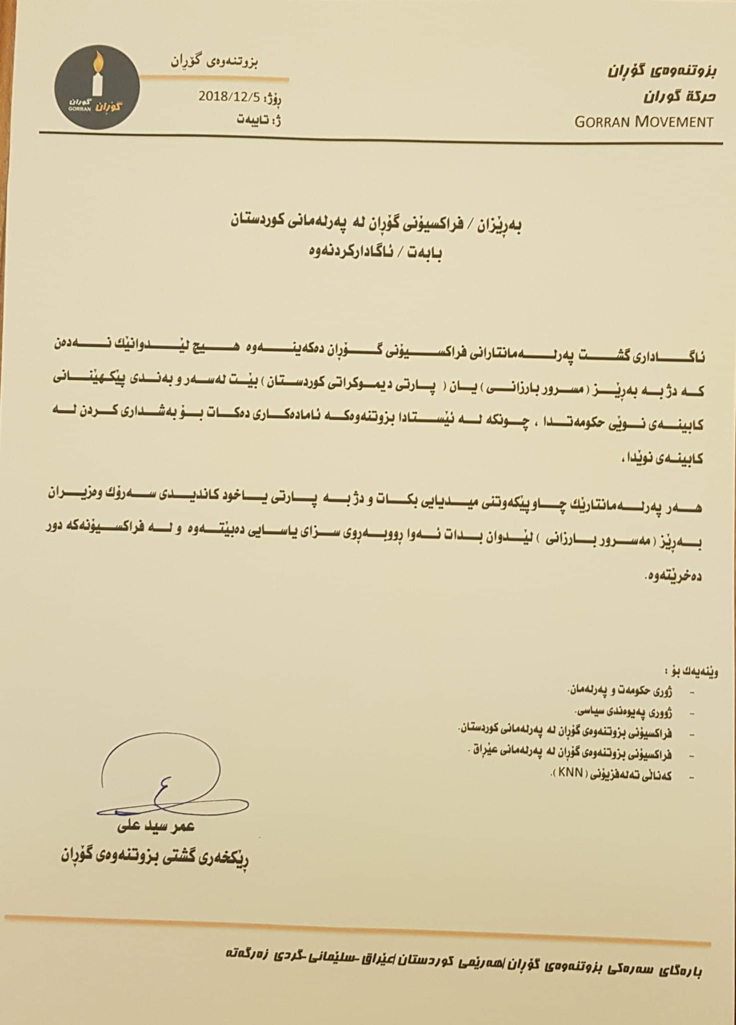 رێکخەری گشتی #بزووتنەوەی گۆڕان#، #عومەر سەید عەلی# فراکسیۆنی گۆڕان ئاگاداردەکاتەوە کە هیچ لێدوانێک لە دژی مەسرور بارزانی و #پارتی دیموکراتی کوردستان# نەدەن.