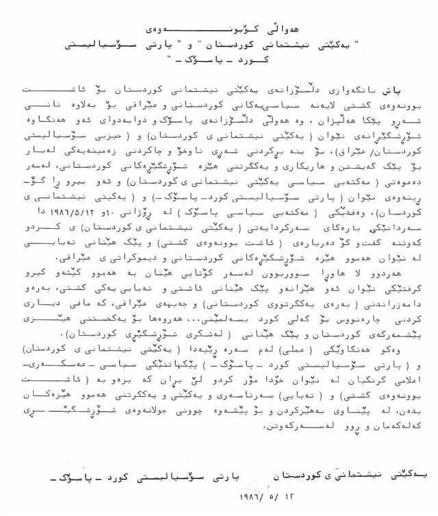 هەواڵی کۆبوونەوەی یەکێتیی نیشتمانیی کوردستان و پارتی سۆسیالیستی کورد - پاسۆک 12-05-1986