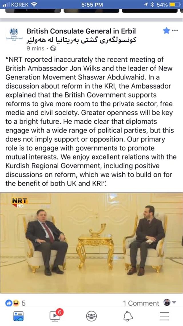 ئێن ئاڕ تی بە نادروستی ڕاپۆرتی لەبارەی کۆبوونەوەیەکی ئەم دواییەی باڵیۆزی بەریتانیا جۆن ویلکس و سەرۆکی جووڵانەوەی #نەوەی نوێ# #شاسوار عەبدولواحید# بڵاوکردووەتەوە.