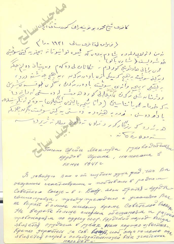 تێبینی: ئەم کاغەزەم لە ئەرشیفی مامۆستا ڕەفیق حیلمی دەست کەوتووە و وەکو خۆی لە یادی دامەزراندنی کۆماری کوردستاندا بڵاوی دەکەمەوە، هەر کەس و کەناڵێکی ڕاگەیاندن دەتوانێ بە ئاماژە کردن بۆ سەرچاوەکەی بڵاوی کاتەوە..بە پێی کۆمێنتێکی مامۆستا حەسەنی قازی قاغەزەکە دەستخەتی ڕەحیمی قازی یە و زۆر وێدەچێ ئەو دەستخەتە ڕووسییەش هەر ئی ئەو بێ کە دەقەکەی وەرگێڕابێتە سەر زمانی ڕووسی.)