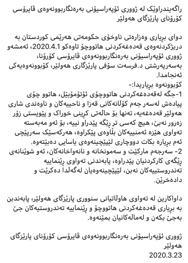 1-جگە لەقەدەغەکردنی هاتووچۆی ئۆتۆمۆبێل، هاتوو چۆی پیادەش لەسەر جەم کۆڵانەکانی قەزا و ناحییەکان و ناوەندی شاری هەولێر قەدەغەیە، تەنها بۆ حاڵەتی کڕینی خوراک و پێویستی زۆر زەرور نەبێ، هیچ کەسی تر ڕێگە پێدراو نییە، بۆ ئەو مەبەستە تەواوی هێزە ئەمنییەکان بڵاوەی پێکراوە، هەرکەسێک سەرپێچی ئەم بڕیارە بکات دووچاری لێپێچینەوەی یاسایی دەبێتەوە.