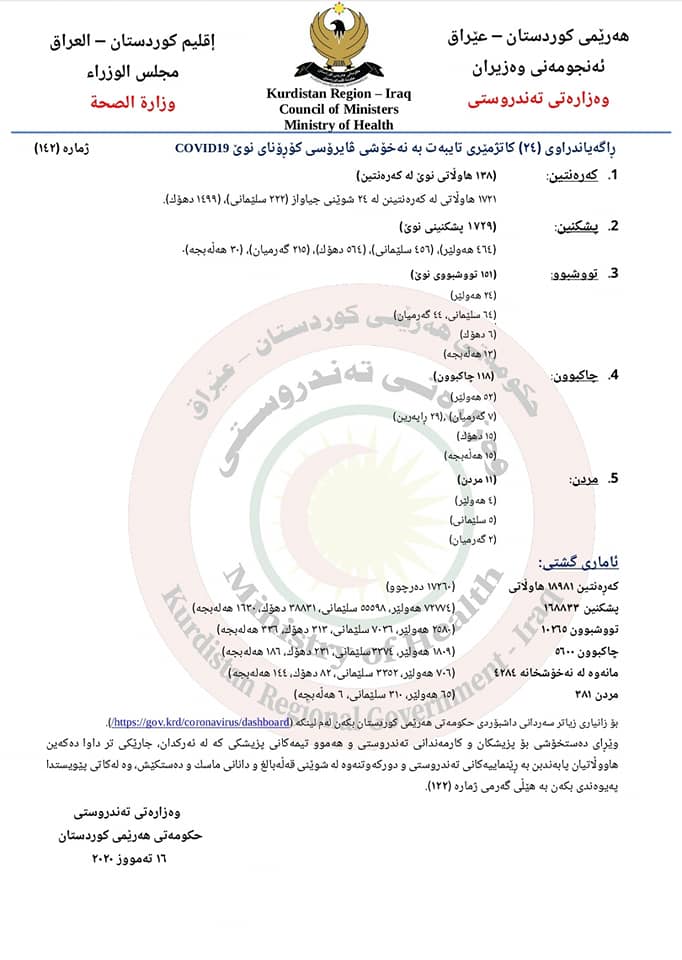 ڕاگەیاندراوی (24) کاتژمێری تایبەت بە نەخۆشی ڤایرۆسی کۆڕۆنای نوێ COVID19