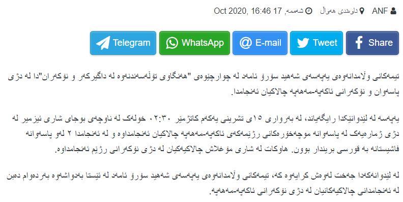 - ڕێکخراوی مافەکانی مرۆڤی #عەفرین# – سوریا ڕایگەیاند، بە پێی زانیاریەکان چەتەکانی ئەلهەمزەی سەر بە دەوڵەتی تورک بەرهەمی زەیتوونی هاوڵاتیەکیان بە ناوی عەکاش داود دزیوە لە گوندی بێکێی ناوچەی بلبل. بەپێی هەمان سەرچاوە بەرهەمی زیاتر لە 90 داری زەیتوون دزراون.[2]