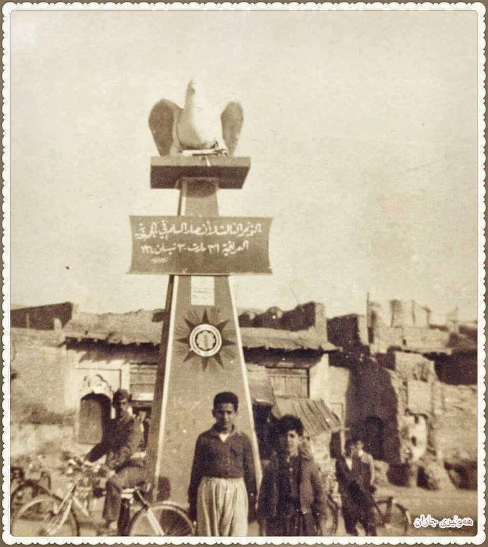 لە زە مانی عدالکریم قاسم، به بونه ی به ستنی کونگره ی (انصار السلام العالمی) ئه و ئارمه ی دیاره له سه ڕ پەیکه ڕه که [ ئارمی کوماری عێراقه ]..... لەپشت پەیکەرەکە ئه و ده ڕگایە ی دیاره مالی خوا لێی خوشبی مام (ولی خدر جامبازه)پاشا ن مالی خوای لی خوشبی (جلال کوری نانه وا) مالی خوای لی خوشبی (مام لطفی) له ته نیشتی بوو، ئه وه ی سواری پاسکیله که یە به به ڕگی عه سکه ڕی (حاجی بدره) ناسراو له بازاری (حنان) ی ده ده لال خانه ی کۆن.....ئه م به يکه ڕه له لايه ن ماموستا ی ڕه حمه تی (جابر بيرداود) دروست کرا - ئه ڕکی تيحونی له لايه ن هه ڕدوو به لينده ڕی نيشتيمان به ڕوه ڕ (شريف جامباز وفائق نادر) ته ڕخان کرا - کاره ئه ندازياريه که - بورج و قاعيده و وسه ڕه وه ی - له لايه ن ئه ندازيار - هاشم عبد الله ڕيک خرا - ياديان به خير - متصرفی هه ولير - بد ڕالدين علی - ڕوخاندی وگۆتی - ئيره ناو گۆڕه پان نه بوایە ئاوده ستم لی دروست ده کرد --- به ڕله و -شه هيد توفيق منيری محامی ئه ندامی ئه نجومه نی ئاشتی جيهانی - له کوريک له هه ولير گۆتی - ئيوه خه لکی هه ولير شانازی به وپه يکه ڕه بکه ن - من زور ولاتانی جيهان که ڕاوم په يکه ڕی مه ليک وئيمبراتورو وقائيد وشاعير وهونه ڕمه ندانم ديوه به لام په يکه ڕيکی تايبه ت به ئاشتی له جيهاندا نه م ديووه.