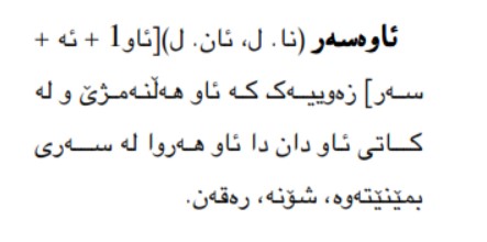 تێبینی: کوردیپێدیا بەهیوایە تەواوی وشە و دەستەواژە کوردییەکانی هەموو شێوەزمانەکان بە پێناسی ڕێزمانییان و خستنە ڕستەیانەوە کۆبکاتەوە و وێنەی پێویستیش بۆ زۆریان پەیدابکات، تکایە یارمەتیی کوردیپێدیا بدە...