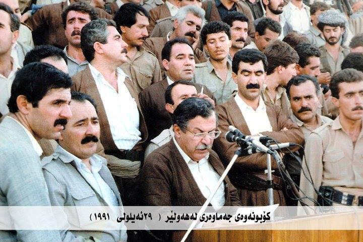 کەسایەتییەکانی ناو وێنەکە: کۆبوونەوەی جەماوەری و #مام جەلال# و #کۆسرەت ڕەسوڵ# و شەهید #حەسەن کوێستانی#.