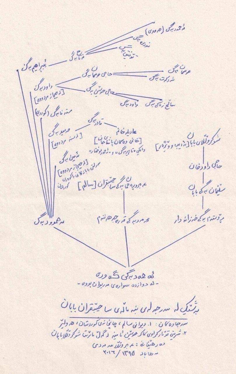 شەجەرەیەکی پڕ له شانازی و کەسایەتی بلیمەتی کوردستان کە بە بنەماڵەی ساحیبقرانی بابان ناسراون و جەدی گەورەیان ئەحمەد بەگی بابان یەکێک بووە له قارەمانانی دوانزە سوارەی مەریوان و لە نەوادەی زانا و ئەهلی ئەدەبی کە بەڕاستی جێی سەرنجێکی تایبەتن دەتوانین ئاماژە بکەین بەم بەڕێزانە: