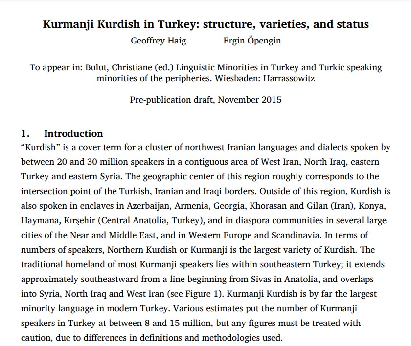 ehir (Central Anatolia, Turkey), and in diaspora communities in several largecities of the Near and Middle East, and in Western Europe and Scandinavia. In terms ofnumbers of speakers, Northern Kurdish or Kurmanji is the largest variety of Kurdish. Thetraditional homeland of most Kurmanji speakers lies within southeastern Turkey; it extendsapproximately southeastward from a line beginning from Sivas in Anatolia, and overlapsinto Syria, North Iraq and West Iran (see Figure 1). Kurmanji Kurdish is by far the largestminority language in modern Turkey. Various estimates put the number of Kurmanjispeakers in Turkey at between 8 and 15 million, but any figures must be treated withcaution, due to differences in definitions and methodologies used.[1]