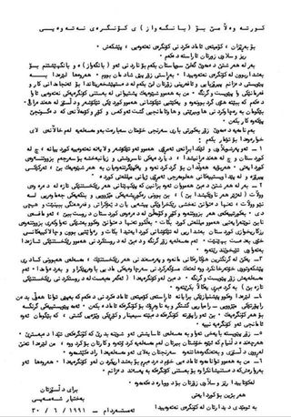 بەر لە هەر شتێ دەمەوێ گەلێ سوپاستان بکەم بۆ ناردنی ئەو (بانگەوز)ە و بانگهێشتبوونم بۆ بەشداربوون لە کۆنگرەی نەتەوەییدا، بەڕاستی زۆر پێی شادمان بوو، هەروەها لێرەدا بە پێویستی دەزانم پیرۆزبای و ئافەرینی زۆرتان لێ بکەم لە دەسپێشخەریتاندا بۆ ئەنجامدانی کار و فەرمانێکی وا پێویست و گرنگ، من بە هەموو شێوەیەک پشتیوانی لە بەستنی کۆنگرەی نەتەوەیی ئاوا دەکەم کە ببێتە هۆی گردبوونەوە و یەکێتی تێکۆشانی هەموو کوردێکی تێکۆشەر و دڵسۆز لە هەندەران.