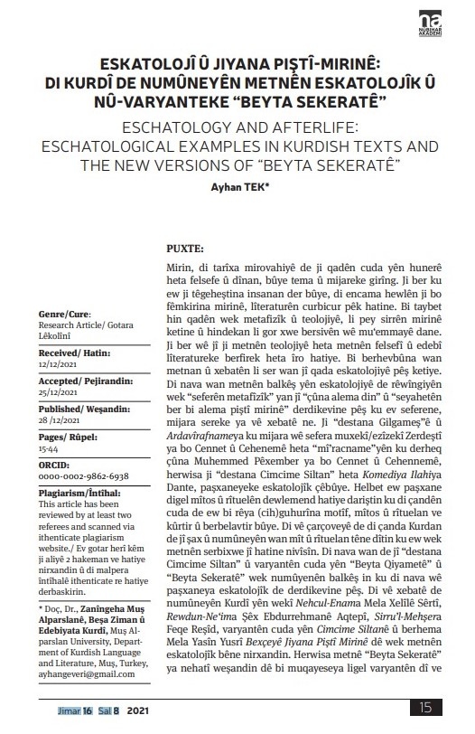 ESKATOLOJÎ Û JIYANA PIŞTÎ-MIRINÊ: DI KURDÎ DE NUMÛNEYÊN METNÊN ESKATOLOJÎK Û NÛ-VARYANTEKE (BEYTA SEKERATÊ).