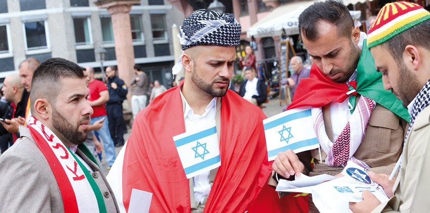 „Nie wieder Judenhass“ steht auf einem Plakat, das ein junger Kurde hochhält. Andere schwenken Israel-Fahnen. Auf vielen Pro-Israel Demonstrationen liefen auch Kurden mit und bekundeten eindeutig ihre Sympathie für den jüdischen Staat